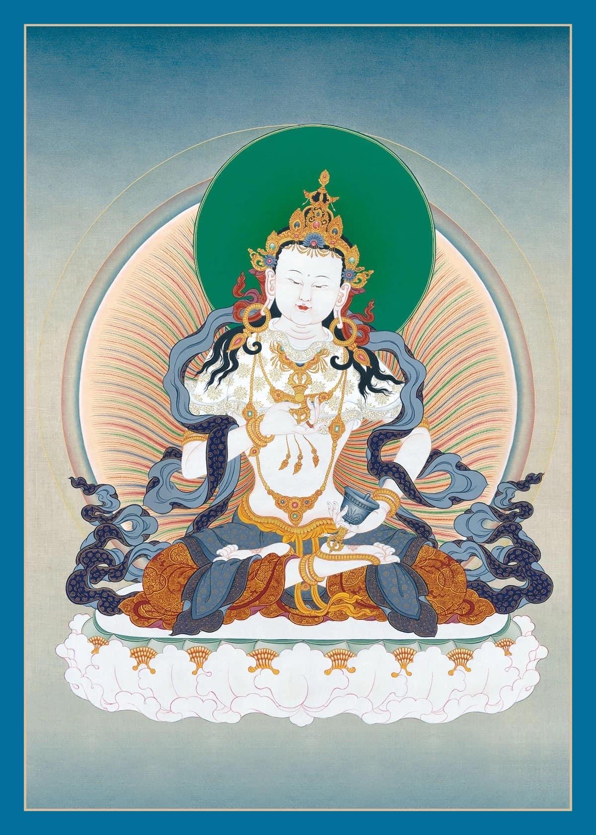 從心間直立的白色金剛杵中,本質是意金剛的加持,形相是如牛乳般潔白的智慧甘露之流降下。